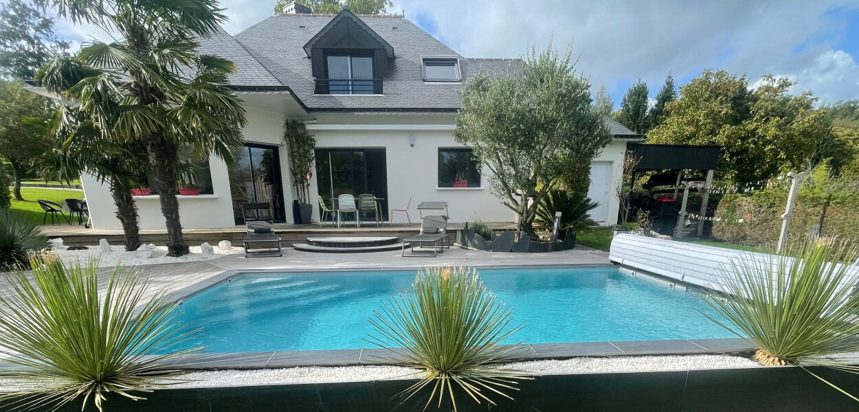 À Locminé, au cœur du Morbihan, nous avons réalisé cette piscine en béton armé de 6m x 4m avec une profondeur de 1,50m, revêtue d'une membrane armée grise pour venir apporter une touche moderne et élégante à l'ensemble.