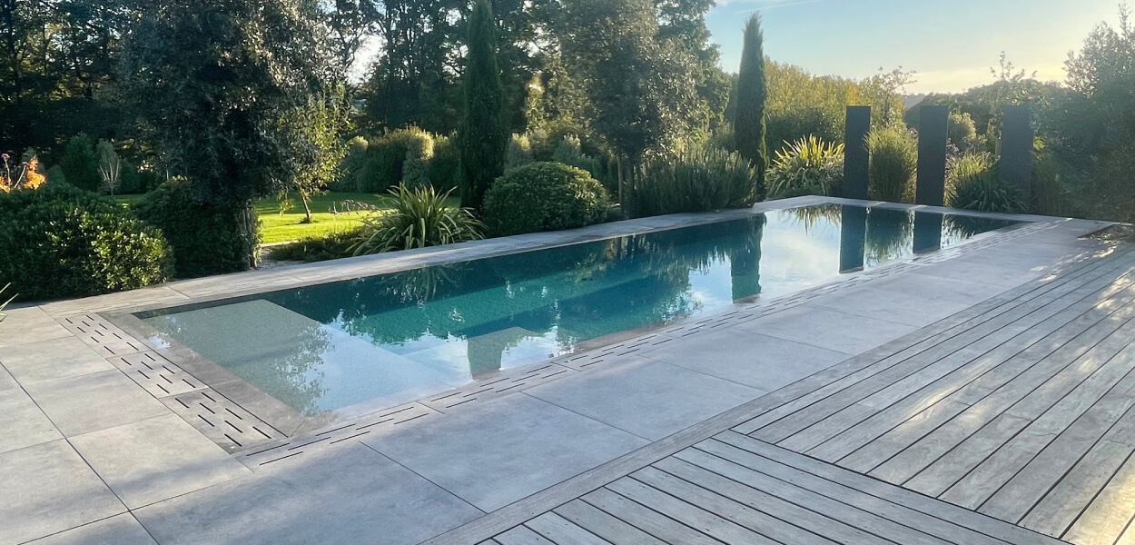 L’aménagement extérieur, également réalisé par l'équipe MGW Piscines, associe une terrasse en bois exotique et un dallage en grès cérame.